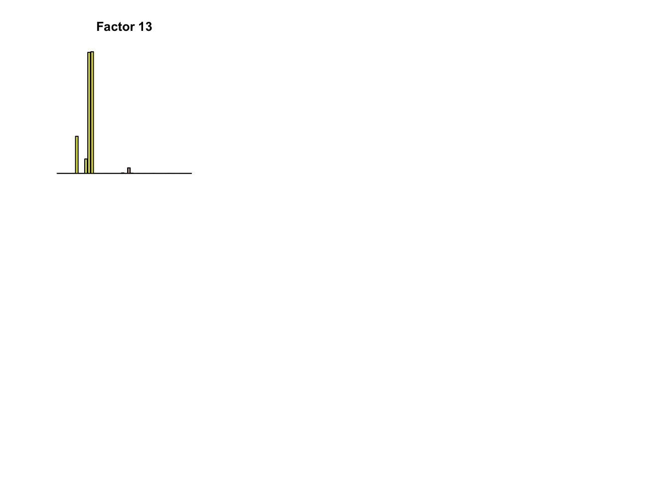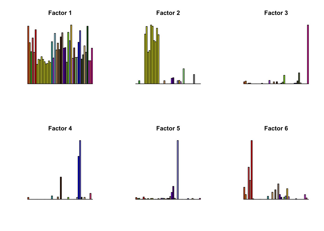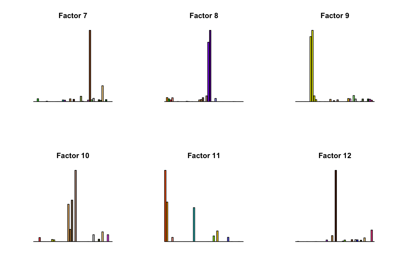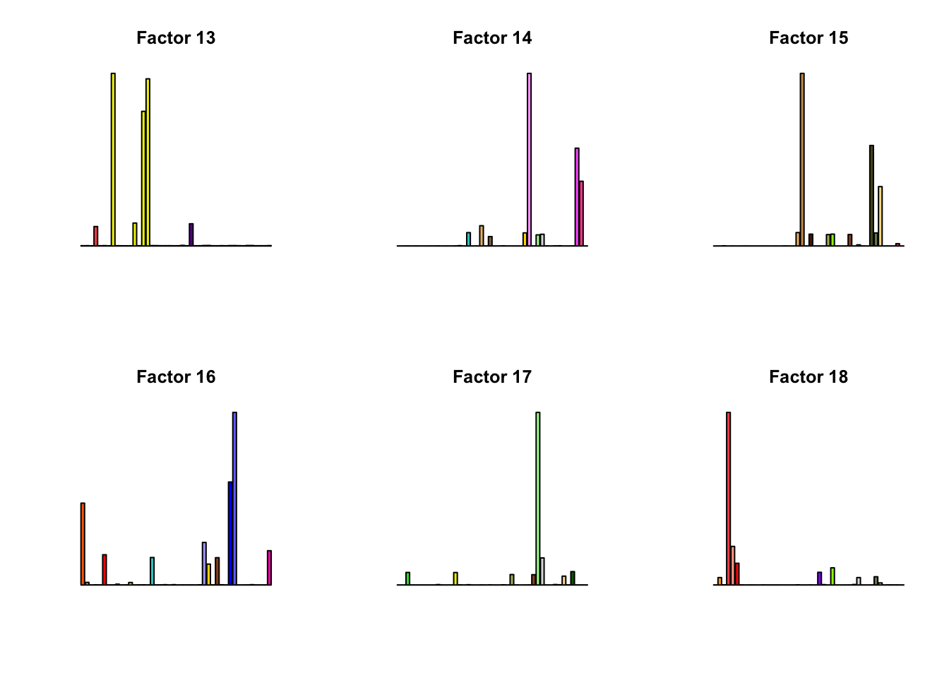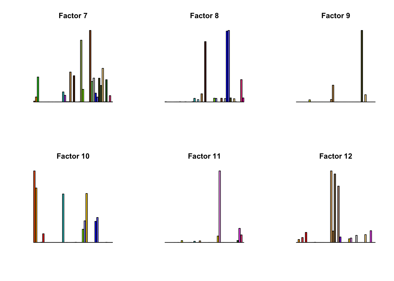 barplot(factors[,k], col=gtex.colors, names.arg = FALSE, axes = FALSE, main=paste0("Factor ", k))