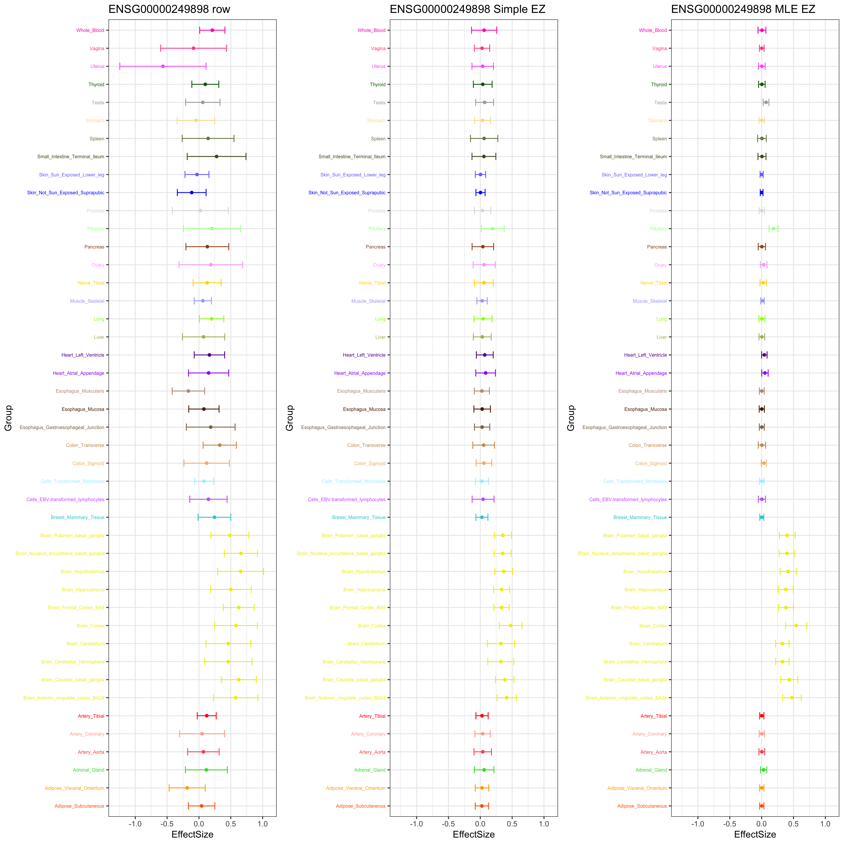 geom_point(show.legend = FALSE, color=gtex.colors) + ylim(c(-1.3,1.1)) + coord_flip() + ggtitle('ENSG00000249898 Simple EZ') +
