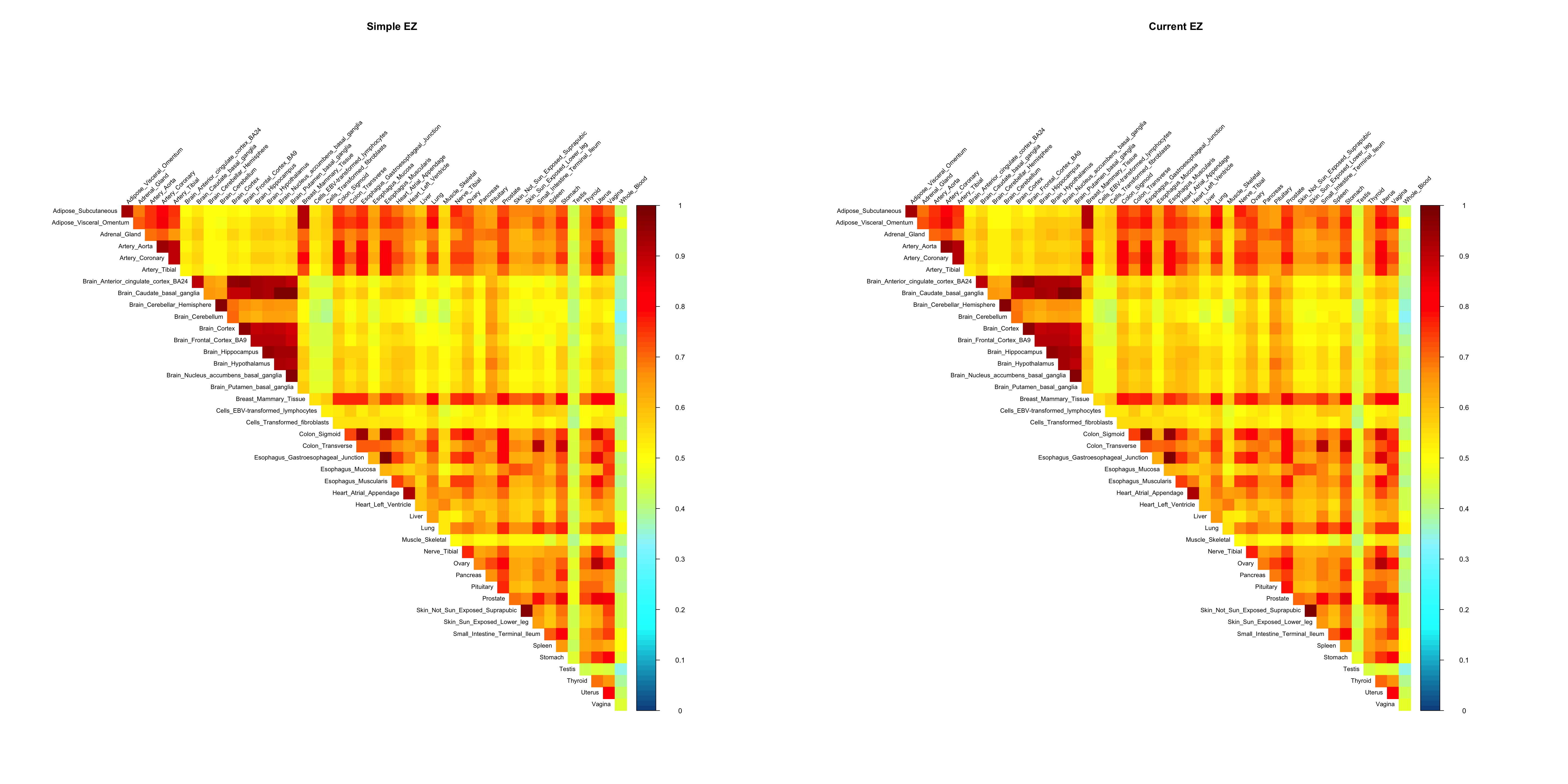 corrplot::corrplot(x, method='color', type='upper', tl.col="black", tl.srt=45, tl.cex = 0.7, diag = FALSE, col=clrs, cl.lim = c(0,1), title = 'Simple EZ', mar=c(0,0,5,0))