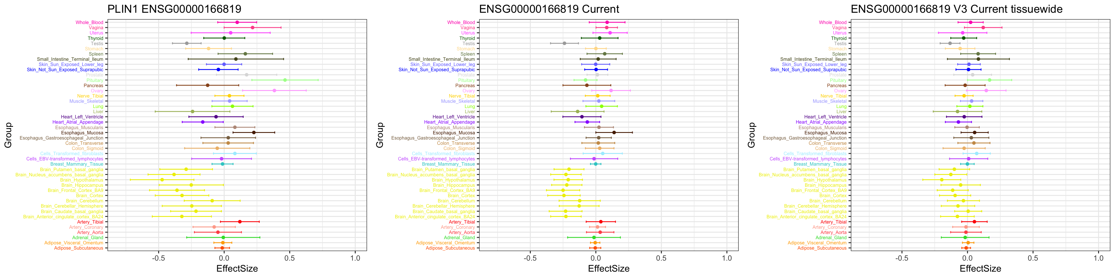 geom_point(show.legend = FALSE, color=gtex.colors) + coord_flip() + ggtitle('PLIN1 ENSG00000166819') + ylim(c(-0.8,1)) + geom_errorbar(aes(ymin=EffectSize-1.96*se, ymax=EffectSize+1.96*se), width=0.4, show.legend = FALSE, color=gtex.colors) +