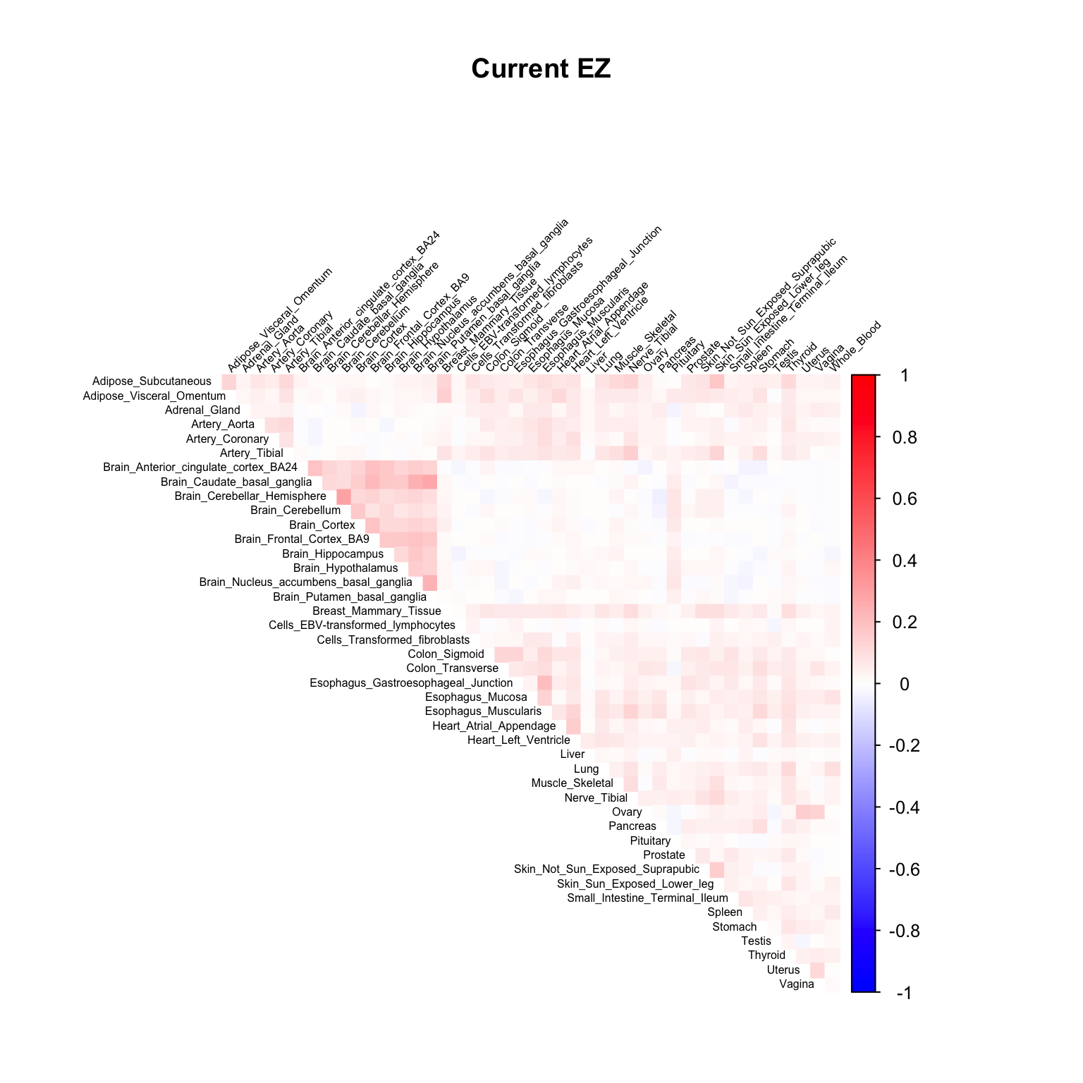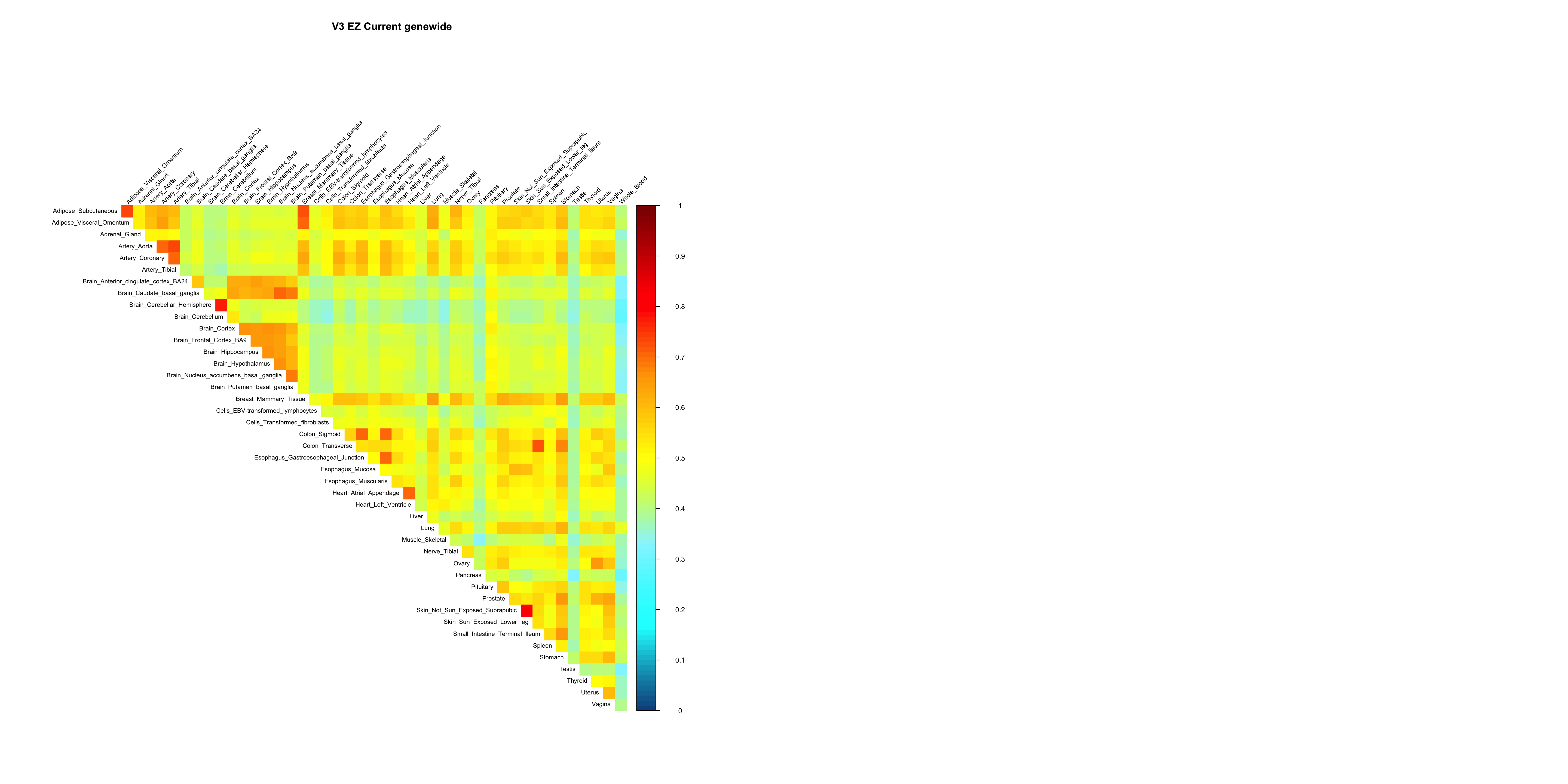 corrplot::corrplot(x, method='color', type='upper', tl.col="black", tl.srt=45, tl.cex = 0.7, diag = FALSE, col=clrs, cl.lim = c(0,1), title = 'V3 EZ Current genewide', mar=c(0,0,5,0))