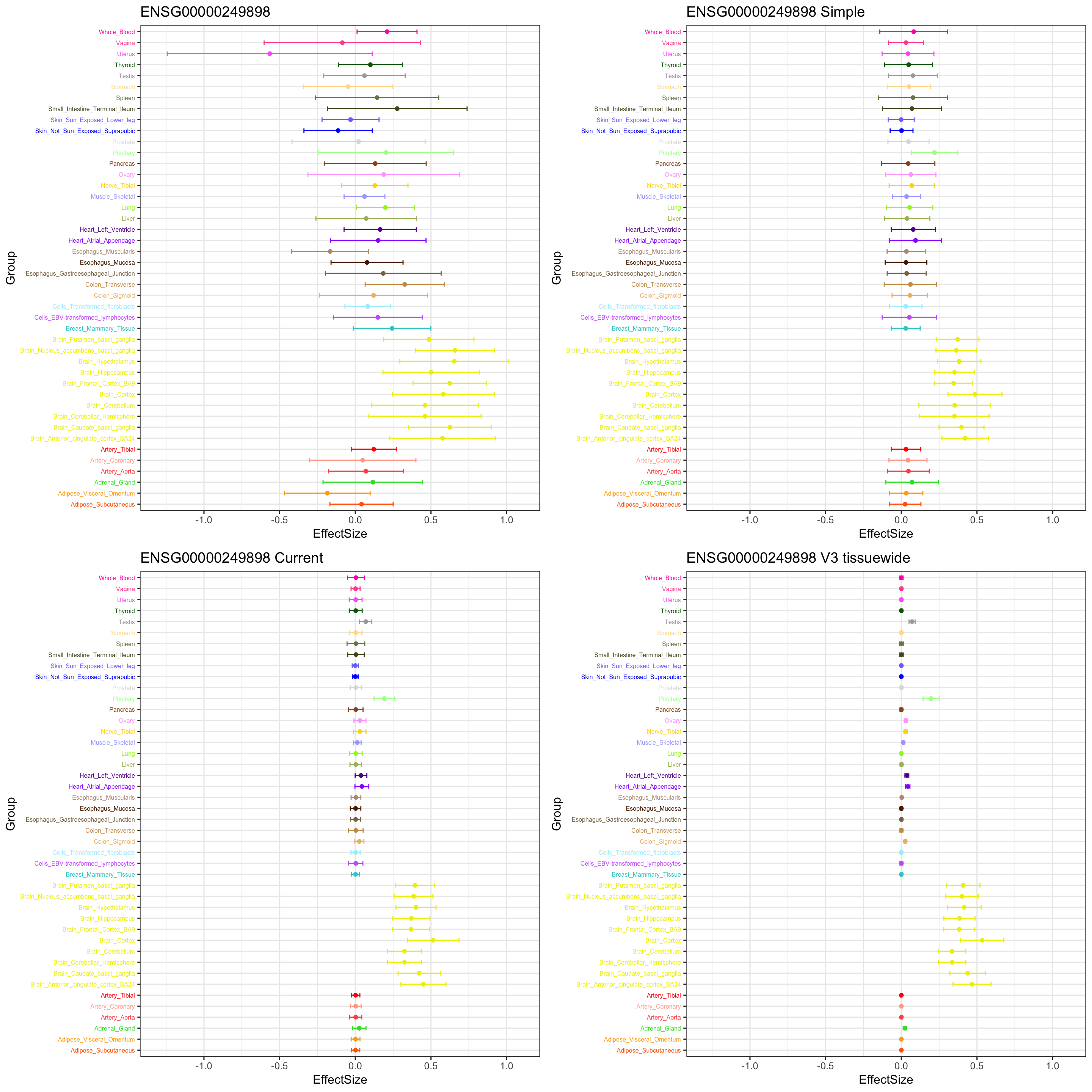 geom_point(show.legend = FALSE, color=gtex.colors) + coord_flip() + ggtitle('ENSG00000249898') + ylim(c(-1.3,1.1)) + geom_errorbar(aes(ymin=EffectSize-1.96*se, ymax=EffectSize+1.96*se), width=0.4, show.legend = FALSE, color=gtex.colors) +