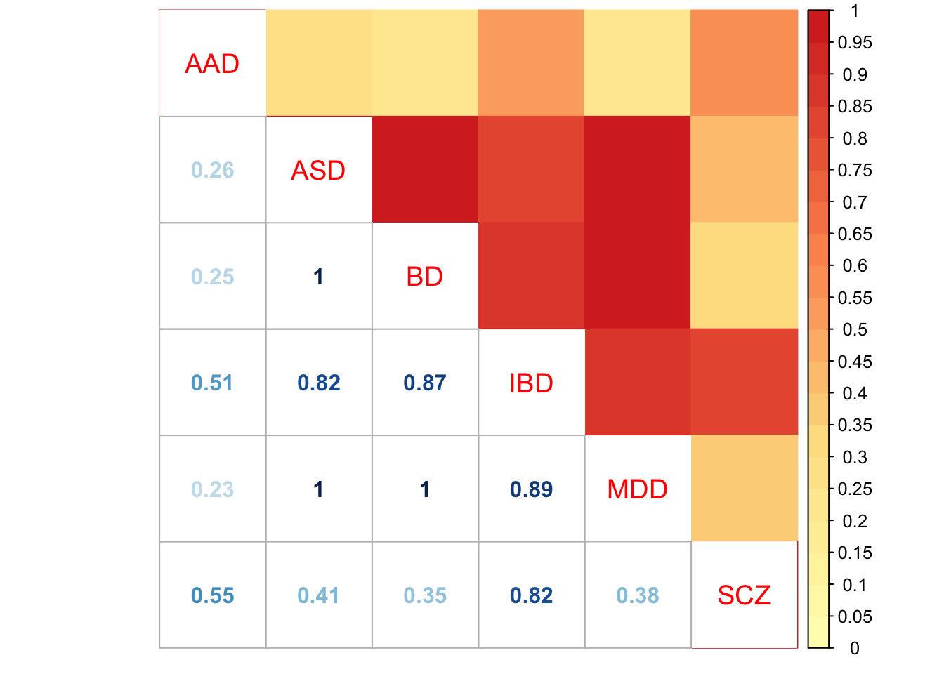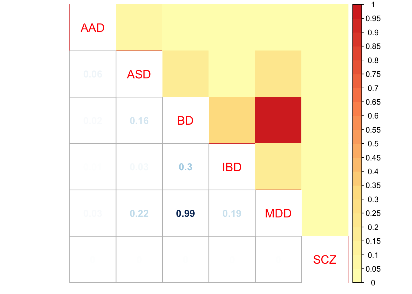 corrplot.mixed(x, tl.pos="d",upper='color', cl.lim=c(0,1), upper.col=colorRampPalette(rev(c("#D73027","#FC8D59","#FEE090","#FFFFBF",