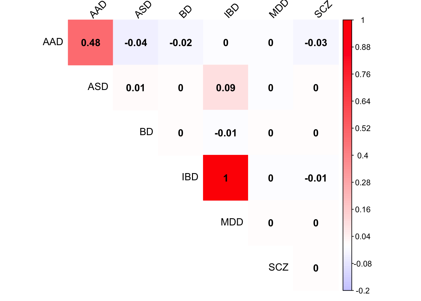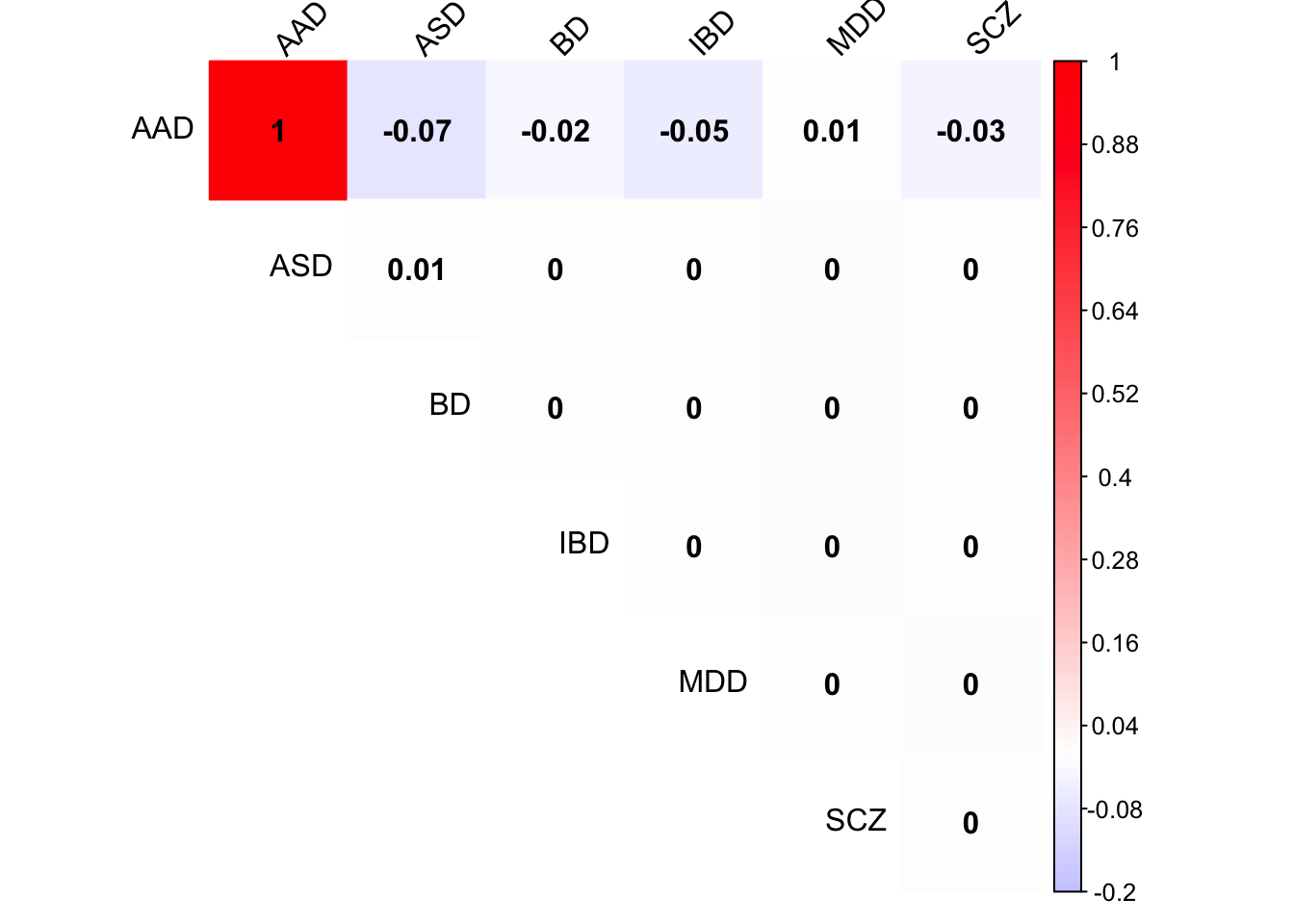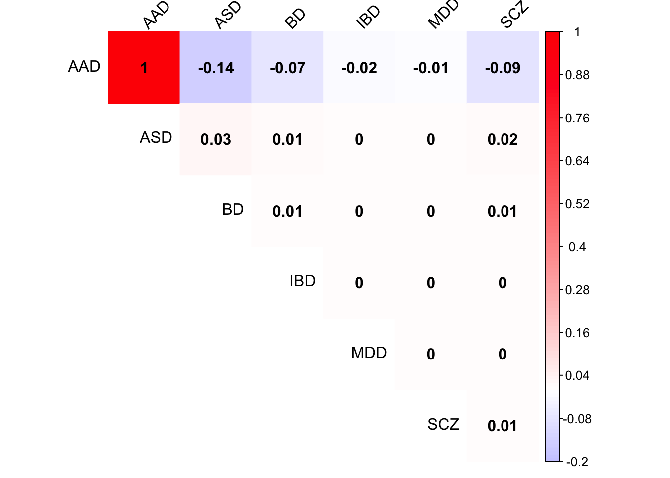 corrplot(x, method='color', cl.lim=c(-0.2,1), type='upper', addCoef.col = "black", tl.col="black", tl.srt=45, col=colorRampPalette(c("blue","white","red"))(200))