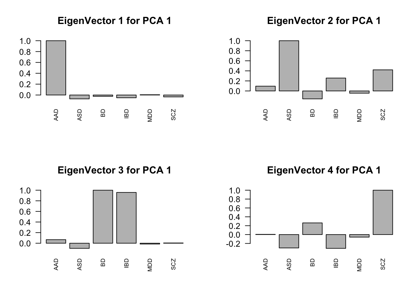 las = 2, main = paste0("EigenVector ", j, " for PCA 1"))