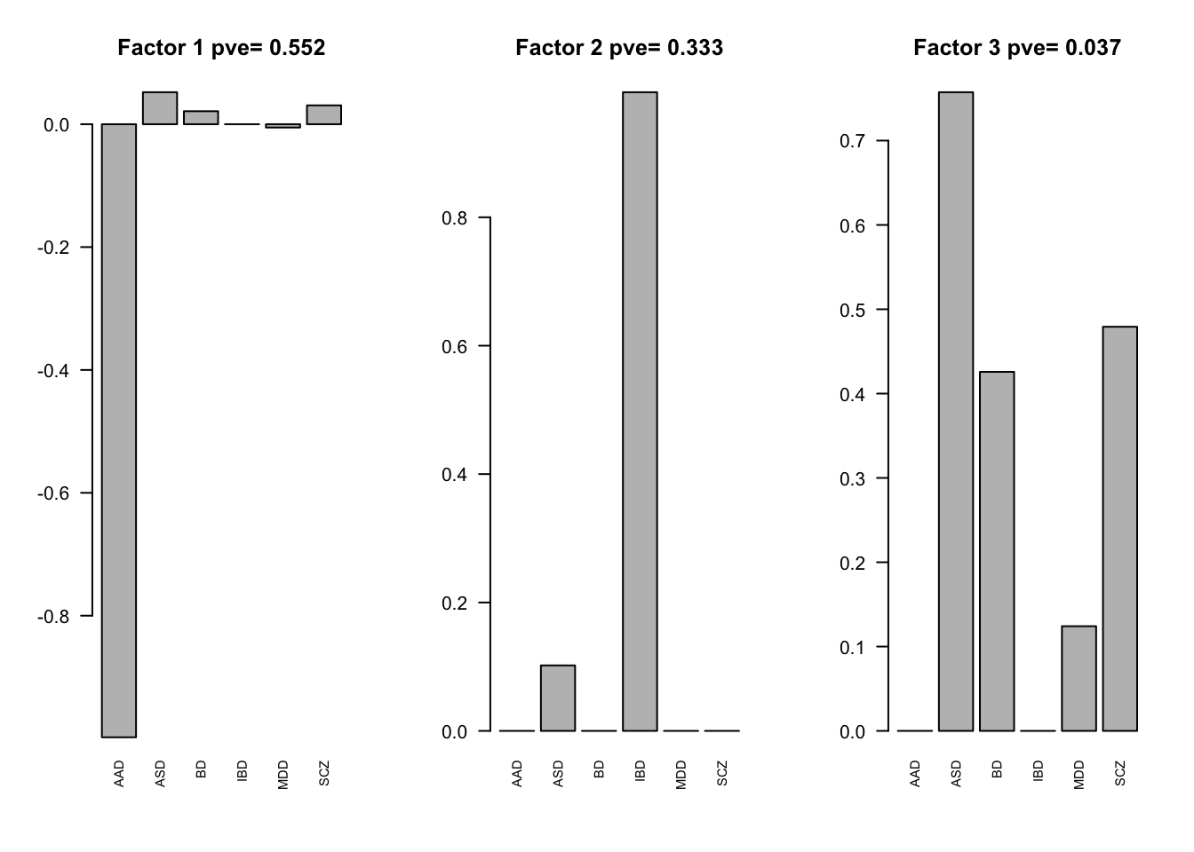 barplot(factors[,i], main=paste0('Factor ',i, ' pve= ', round(flash_get_pve(fmodel)[i],3)), las=2, cex.names = 0.7)