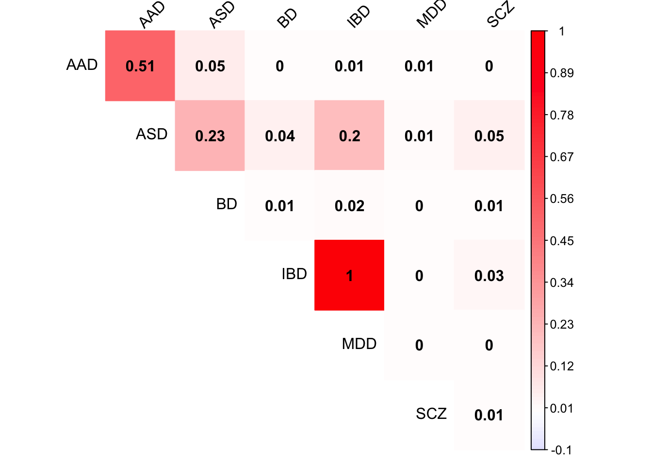 corrplot(x, method='color', cl.lim=c(-0.1,1), type='upper', addCoef.col = "black", tl.col="black", tl.srt=45, col=colorRampPalette(c("blue","white","red"))(200))