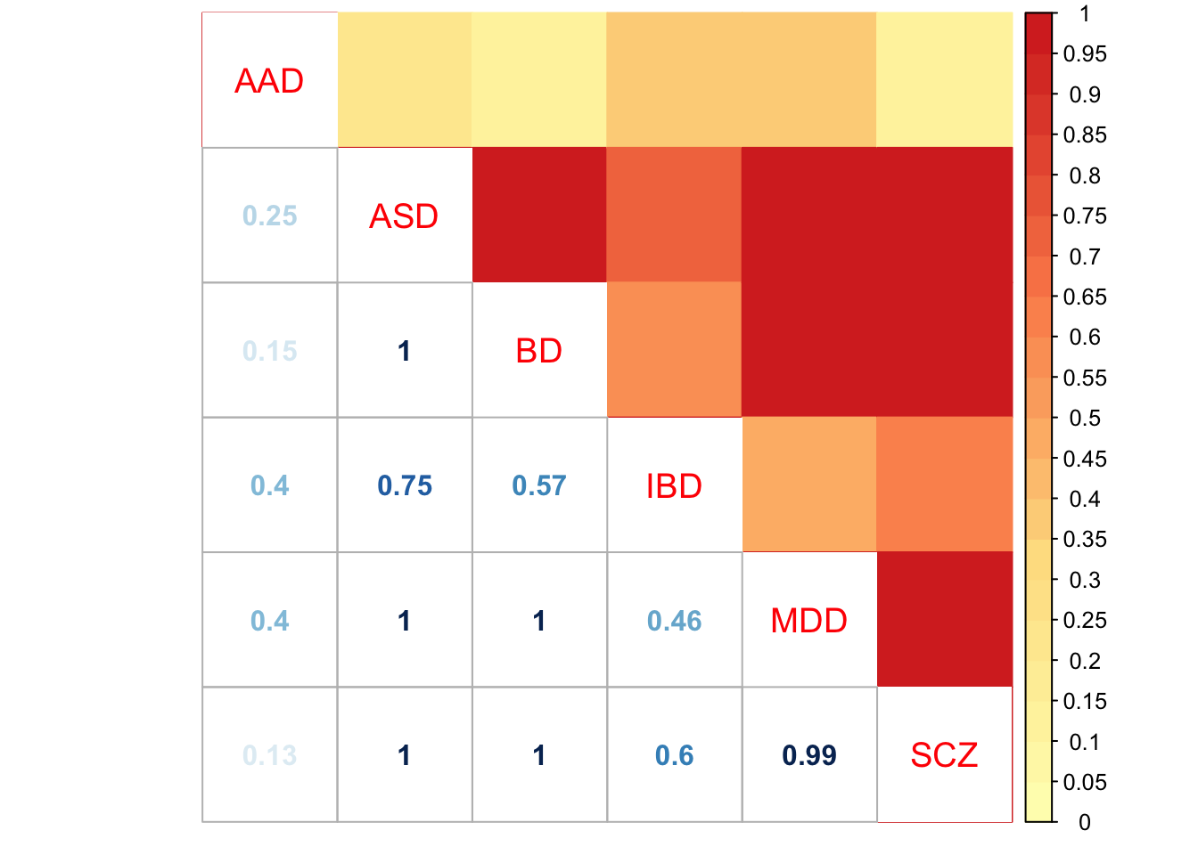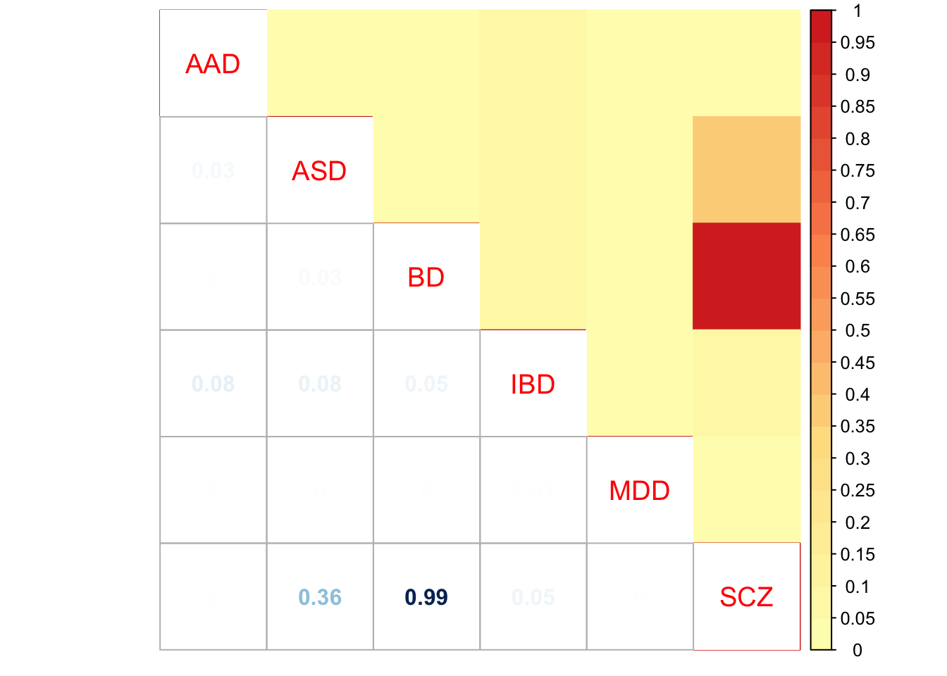 corrplot.mixed(x, tl.pos="d",upper='color', cl.lim=c(0,1), upper.col=colorRampPalette(rev(c("#D73027","#FC8D59","#FEE090","#FFFFBF",