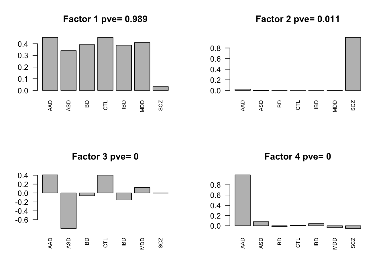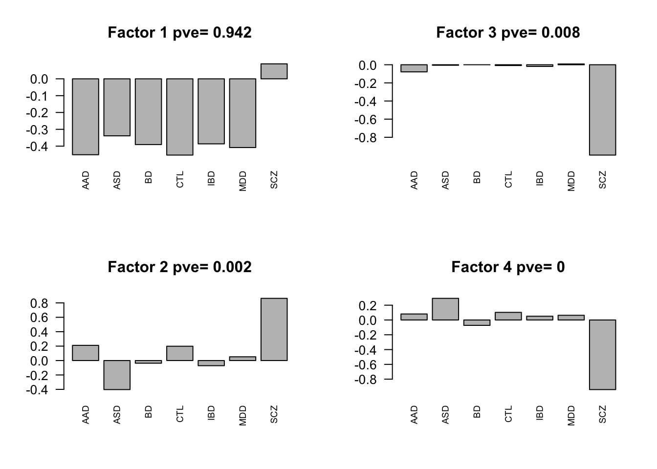 barplot(factors[,i], main=paste0('Factor ',i, ' pve= ', round(flash_get_pve(flash.model.c)[i],3)), las=2, cex.names = 0.7)
