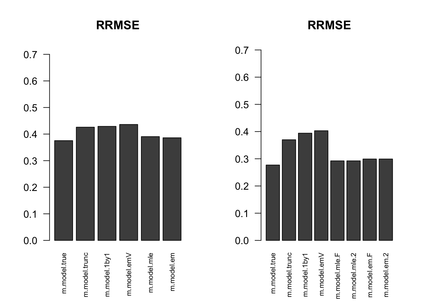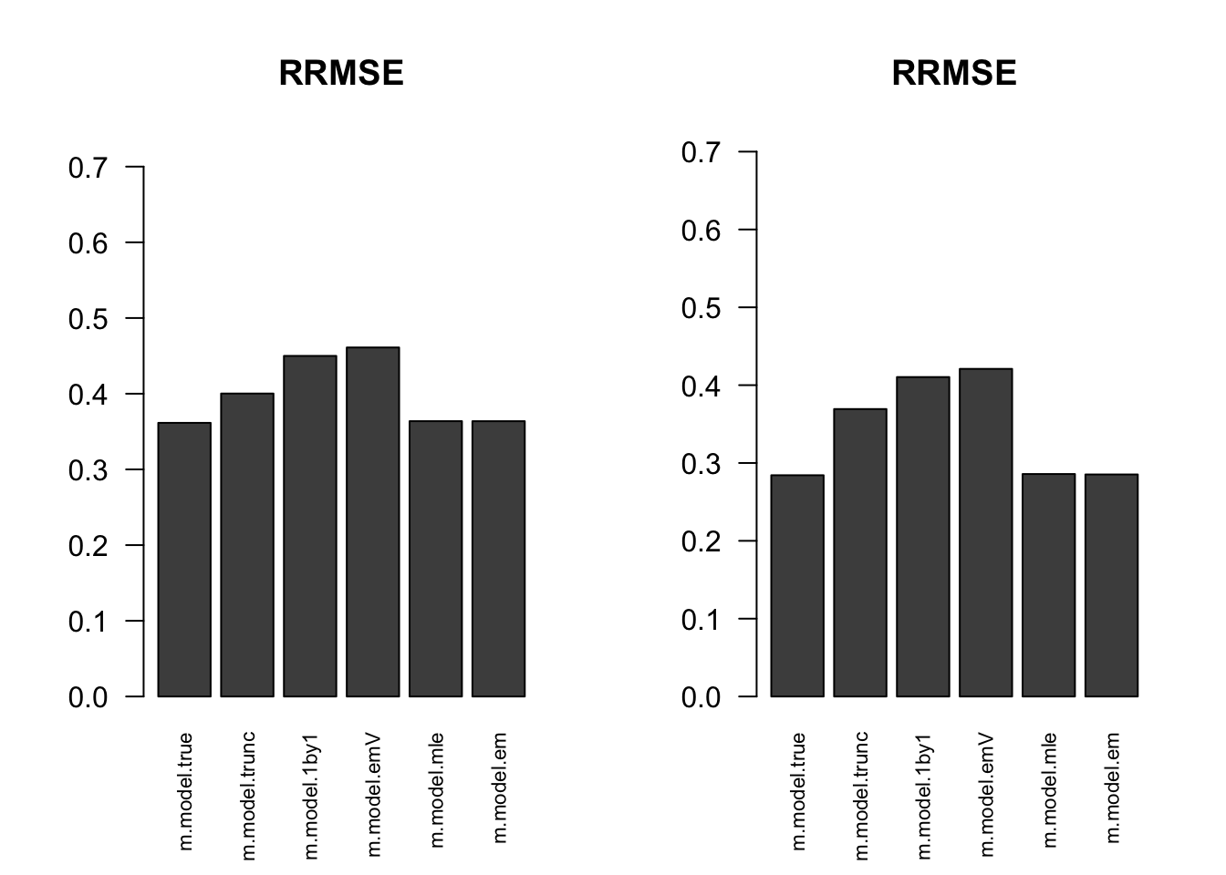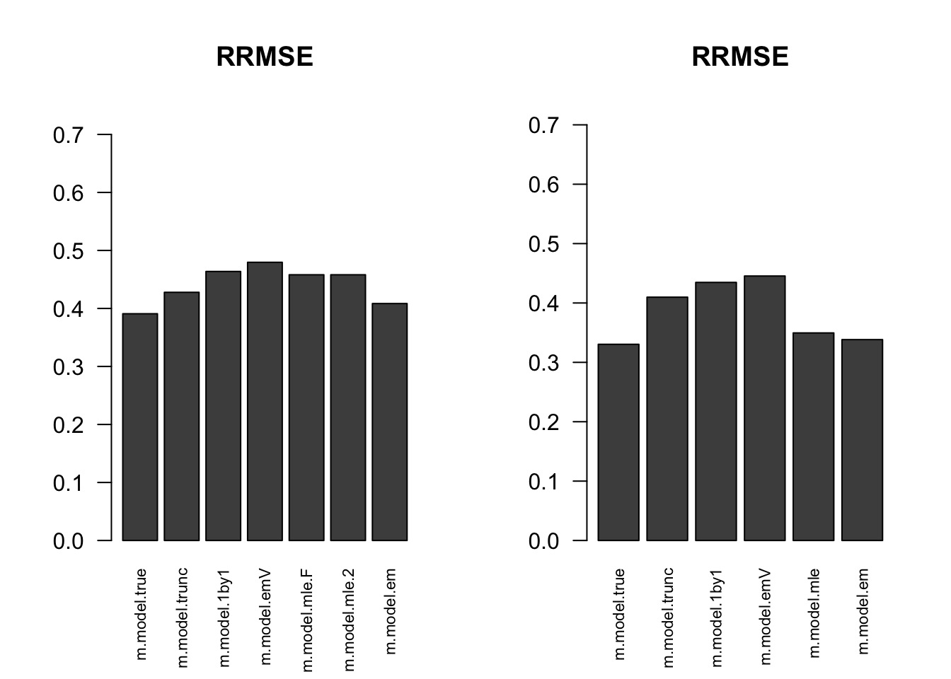 colnames(temp) = c('True', 'Trunc','m.1by1', 'MLE','MLE.F', 'MLE.2', 'EM', 'EM.F', 'EM.2','EMV')