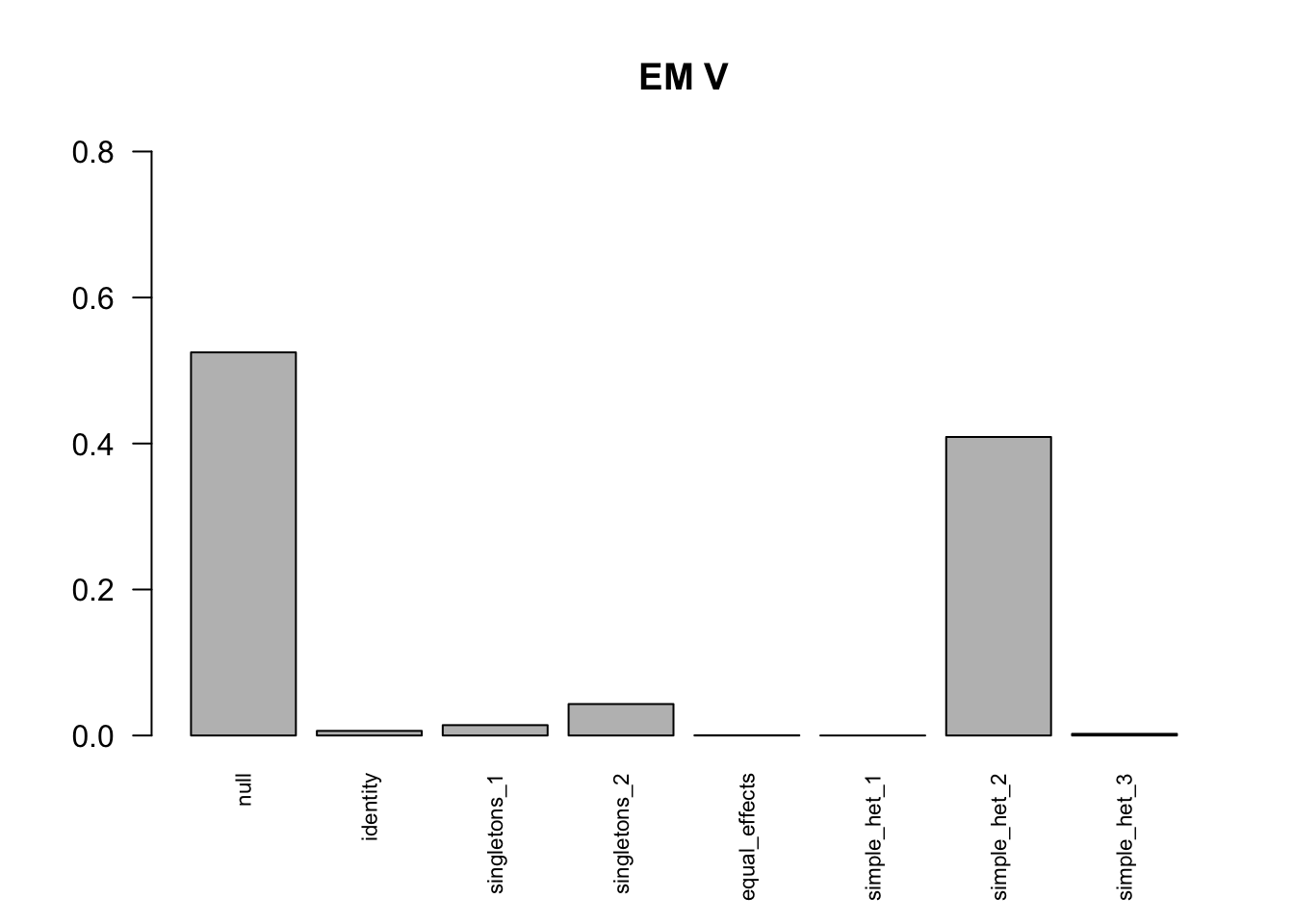 barplot(get_estimated_pi(m.em), las=2, cex.names = 0.7, main='EM V', ylim=c(0,0.8))