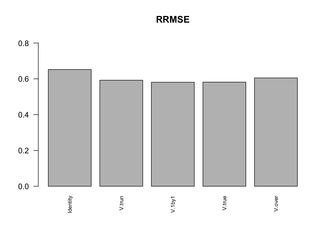 barplot(rrmse, ylim=c(0,(1+max(rrmse))/2), names.arg = c('Identity','V.trun','V.1by1','V.true','V.over'), las=2, cex.names = 0.7, main='RRMSE')