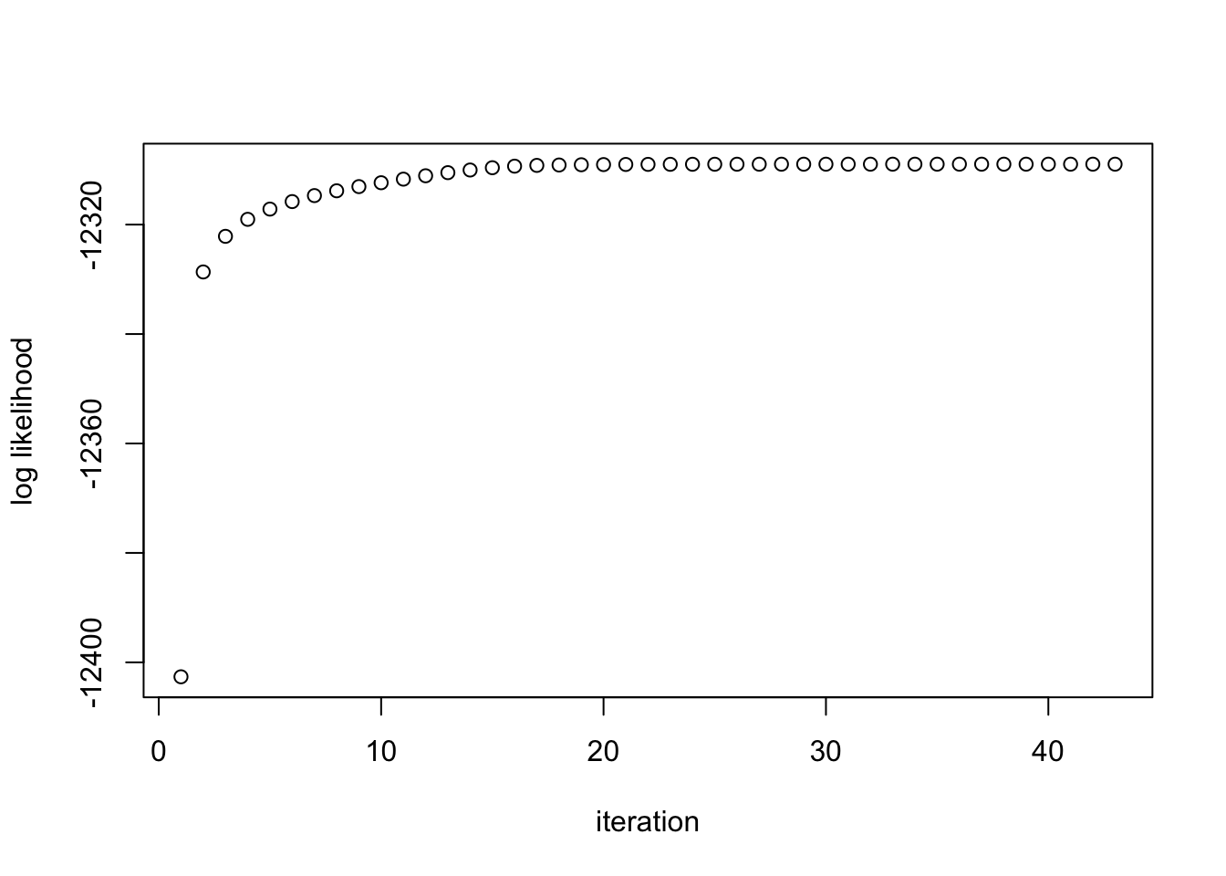plot(result.optim$result$loglik, ylab = 'log likelihood', xlab = 'iteration')