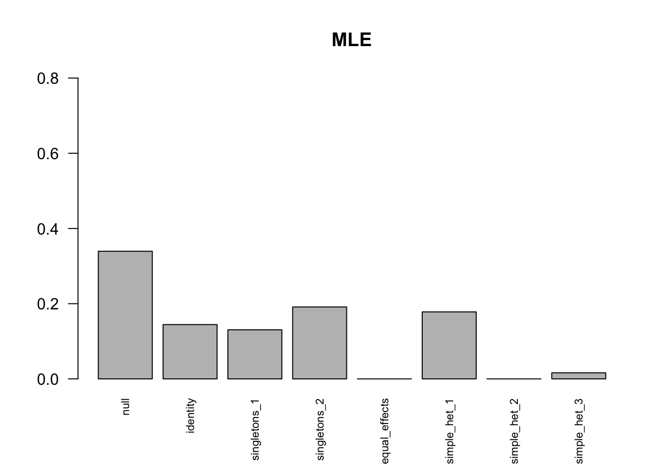 barplot(get_estimated_pi(m.mle), las=2, cex.names = 0.7, main='MLE', ylim=c(0,0.8))