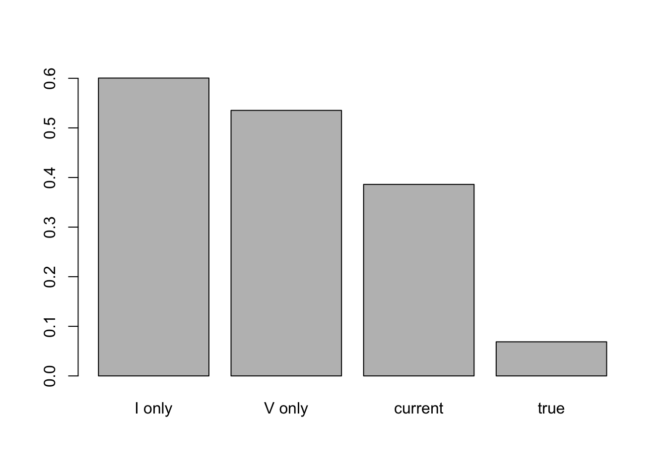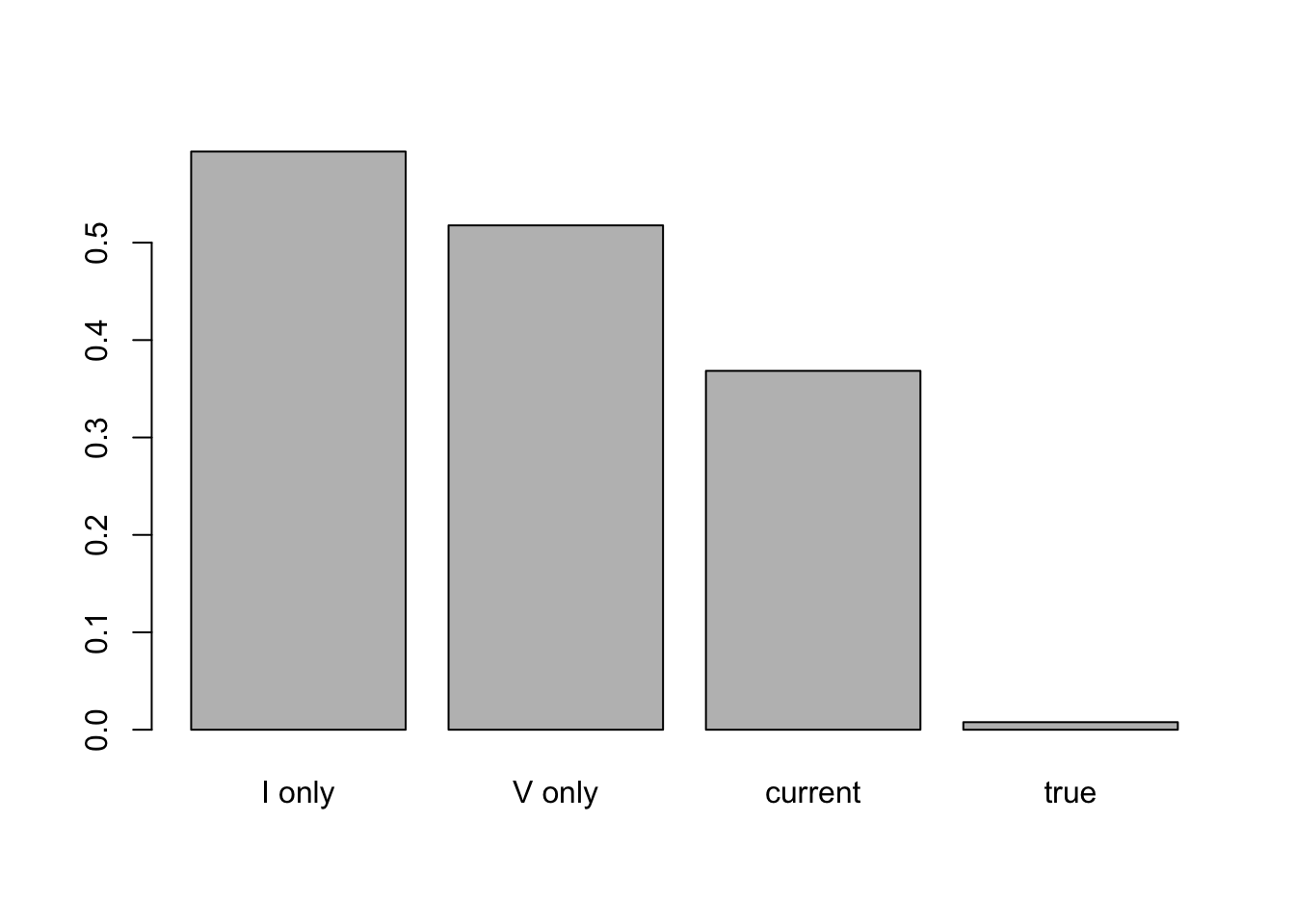 barplot(tmp, names.arg = c('I only', 'V only', 'current', 'true'))